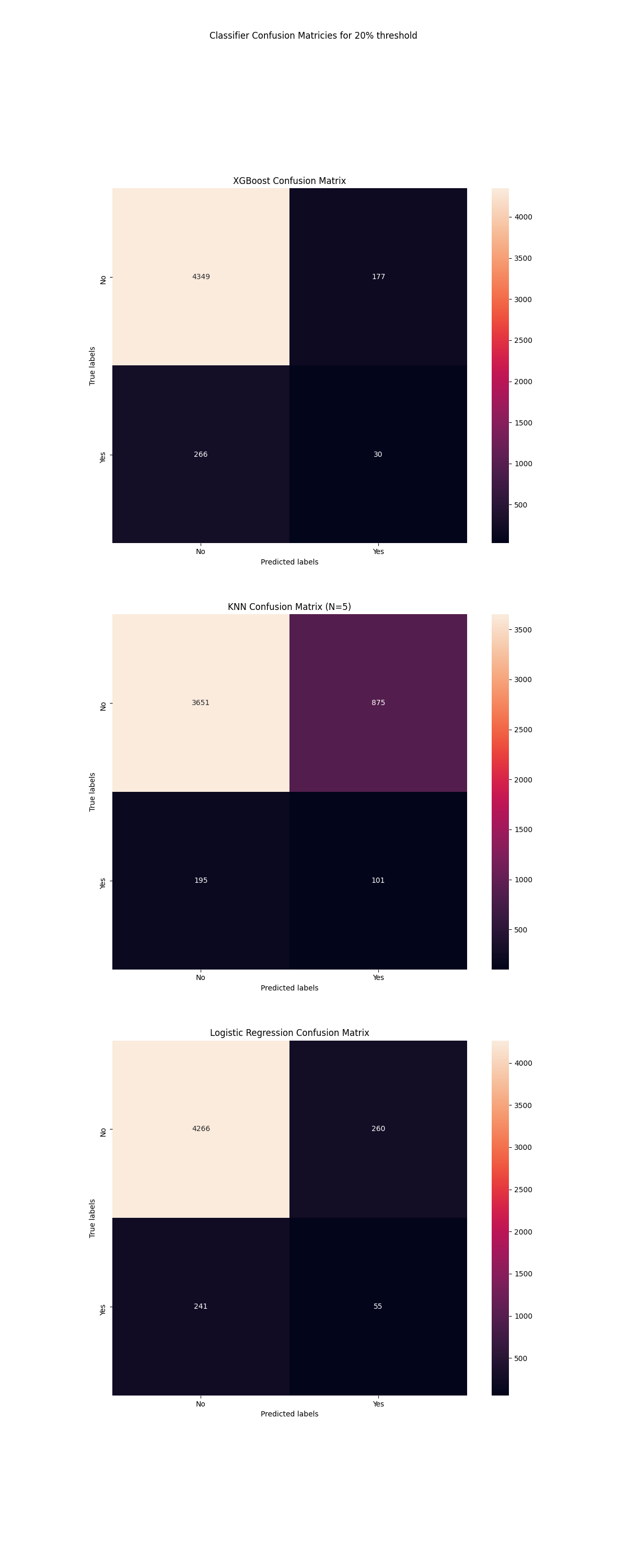 fig.suptitle('Classifier Confusion Matricies for 20% threshold')